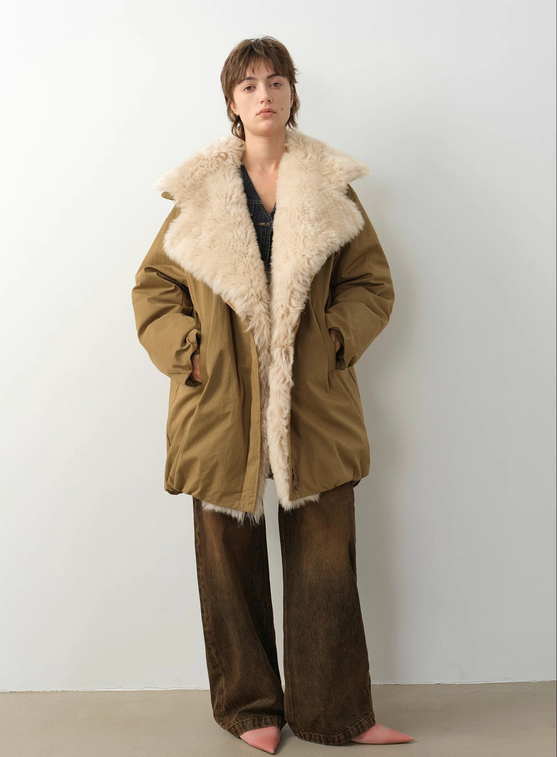 Heavy 90% white goose down, light, fluffy, and full, isolating from the cold air, 100% cotton outer shell + large Tuscan sheep curly fur collar, protecting the neck and cheeks, fearless of cold wind and frost, radiating warmth from the inside, multiple cold-resistant materials create a large-profile body, like a walking sun, fashionable and warm.