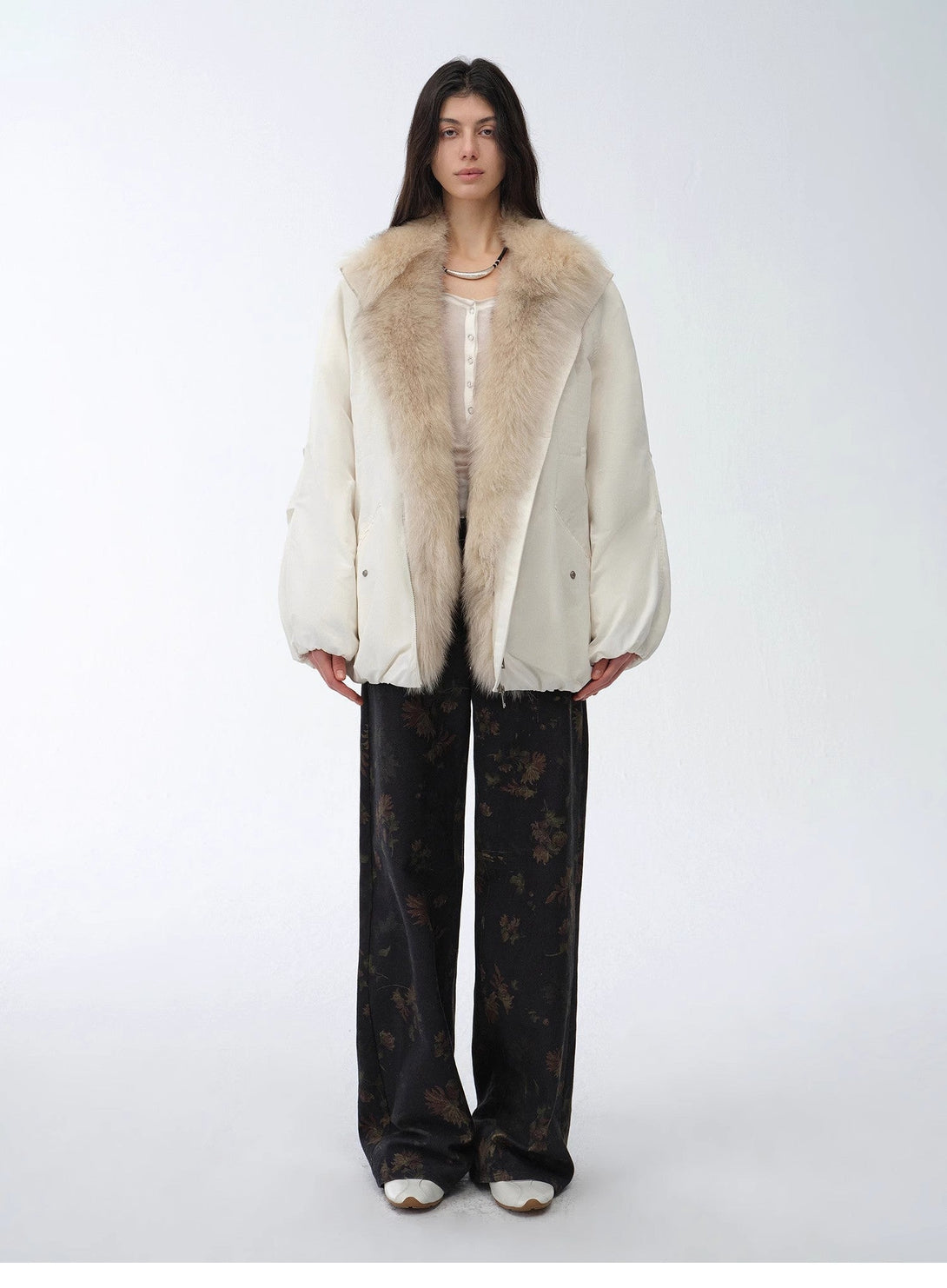 This highly practical down parka is designed for deep winter. Its detachable two-color fox fur collar provides warmth and richness. The collar creates a fashionable collision with the garment's body, giving it a sense of layering! The lining is filled with 90% goose down, which is fluffy and warm and can isolate the cold wind.